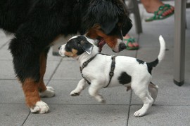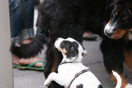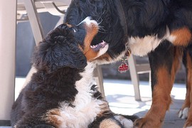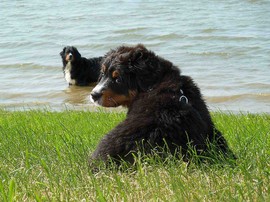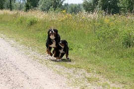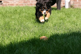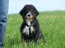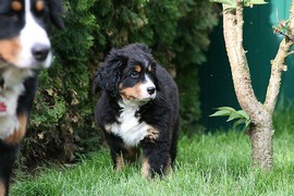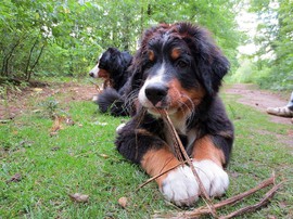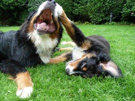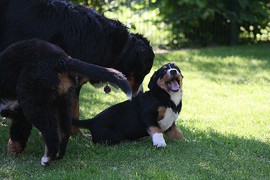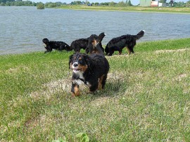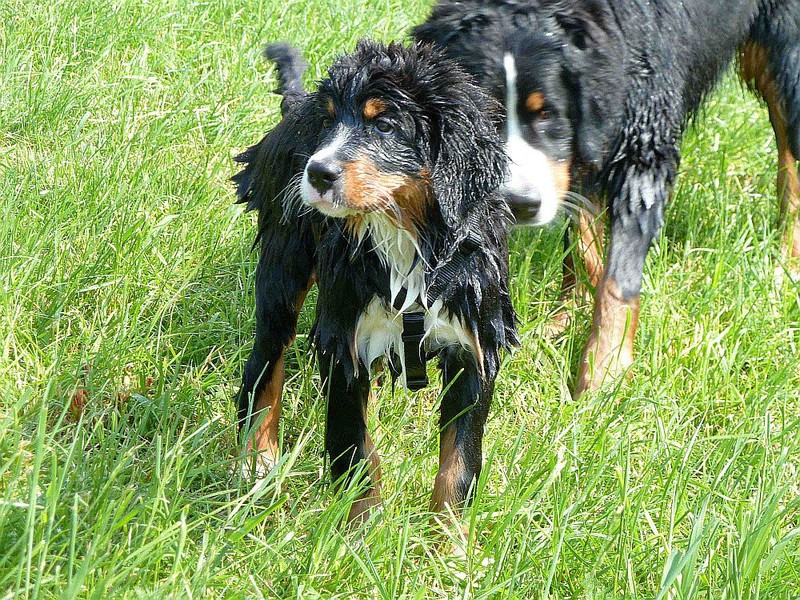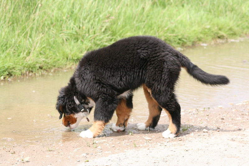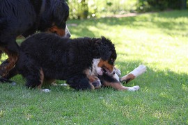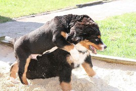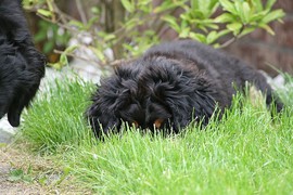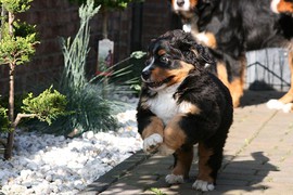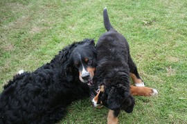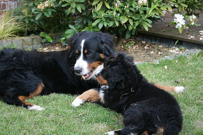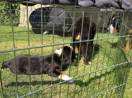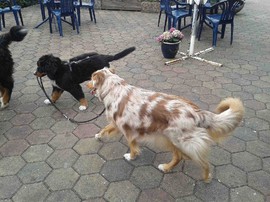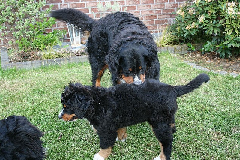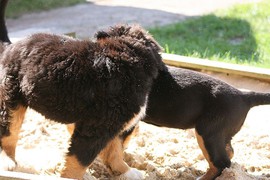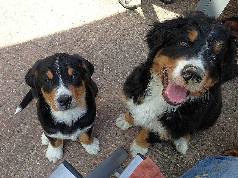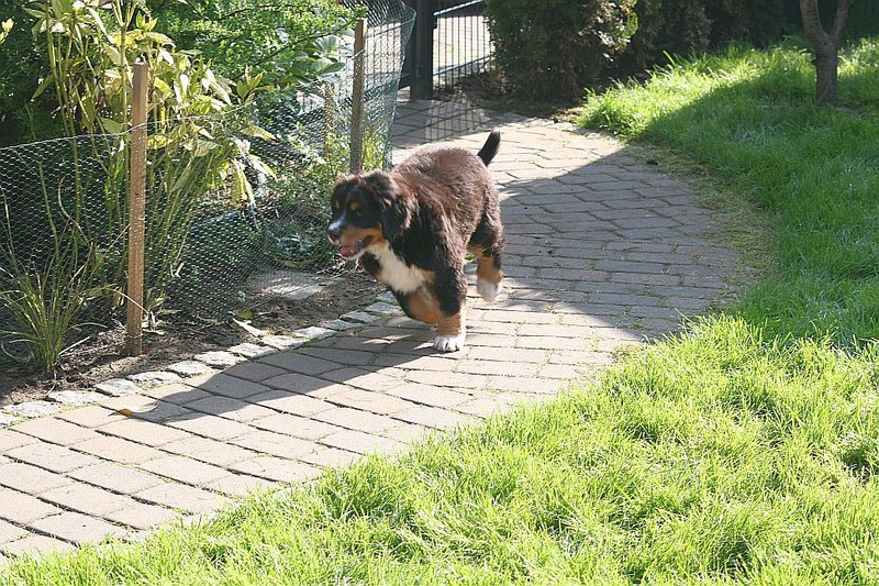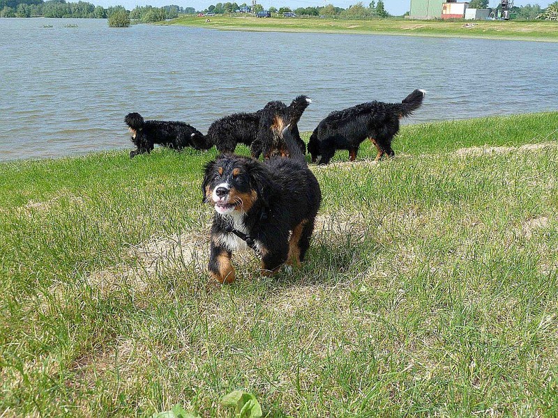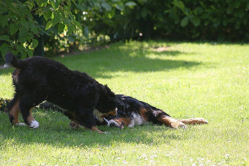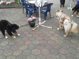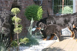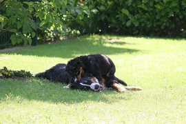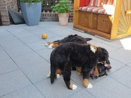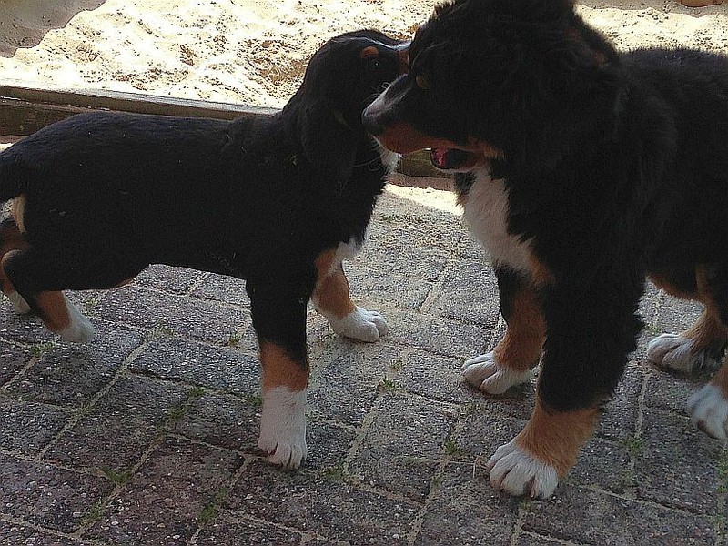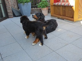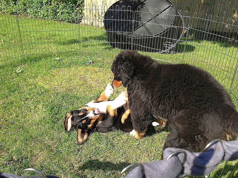Während die Zweibeiner bei schönstem Sonnenschein und einem reichhaltigen Frühstück gut gespeist haben, tobten Vito (9 Wochen) und Amie (11 1/2 Wochen) herum. Die Zwei haben sich super verstanden. Es war ein toller Vormittag!